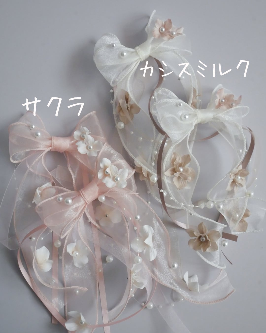 リボンについている花びらやパールは強く引っ張ると取れてしまう可能性がありますので、ご注意ください。